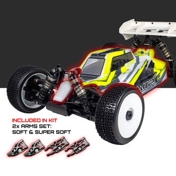 Its 4WD transmission system delivers exceptional traction and handling, while the lightweight aluminum chassis with stone guards ensures rigidity and protection. The aerodynamic bodyshell, front and rear differentials, and reinforced wing stay provide the perfect balance of speed and strength for competitive racing.